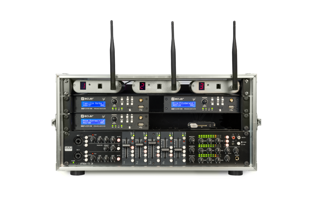 mit 3 Musikplayern, Sendern und einer beliebigen Anzahl von Kopfhörern
